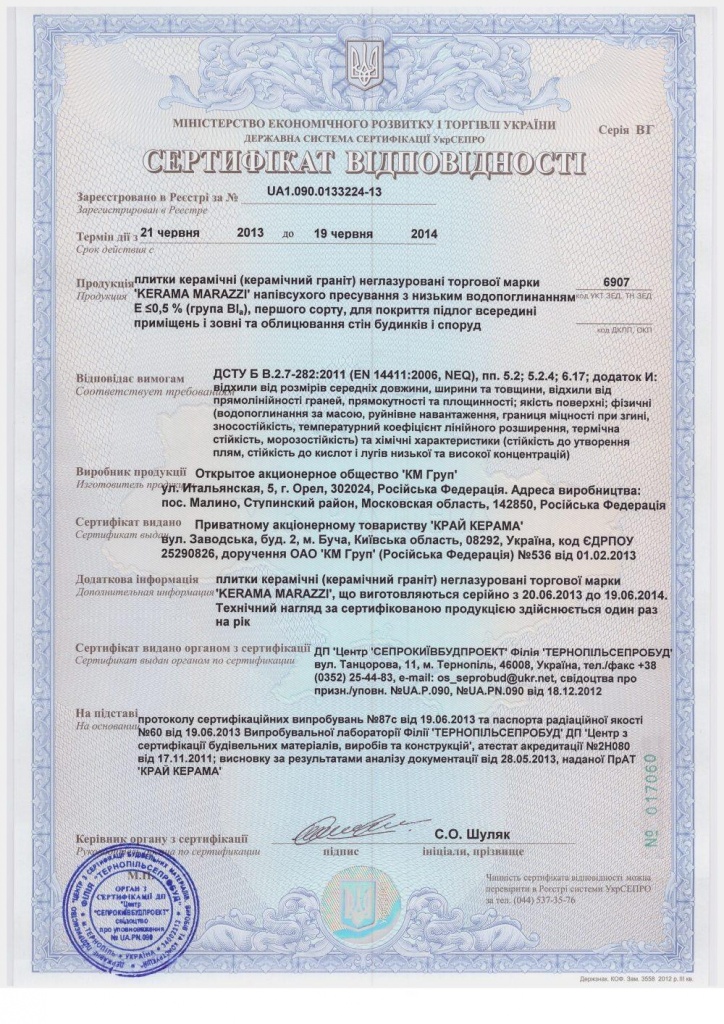 - 13. Плитки керамические керамический гранит глазурованные и неглазурованные, полированные и неполированные т.м. KERAMA MARAZZI