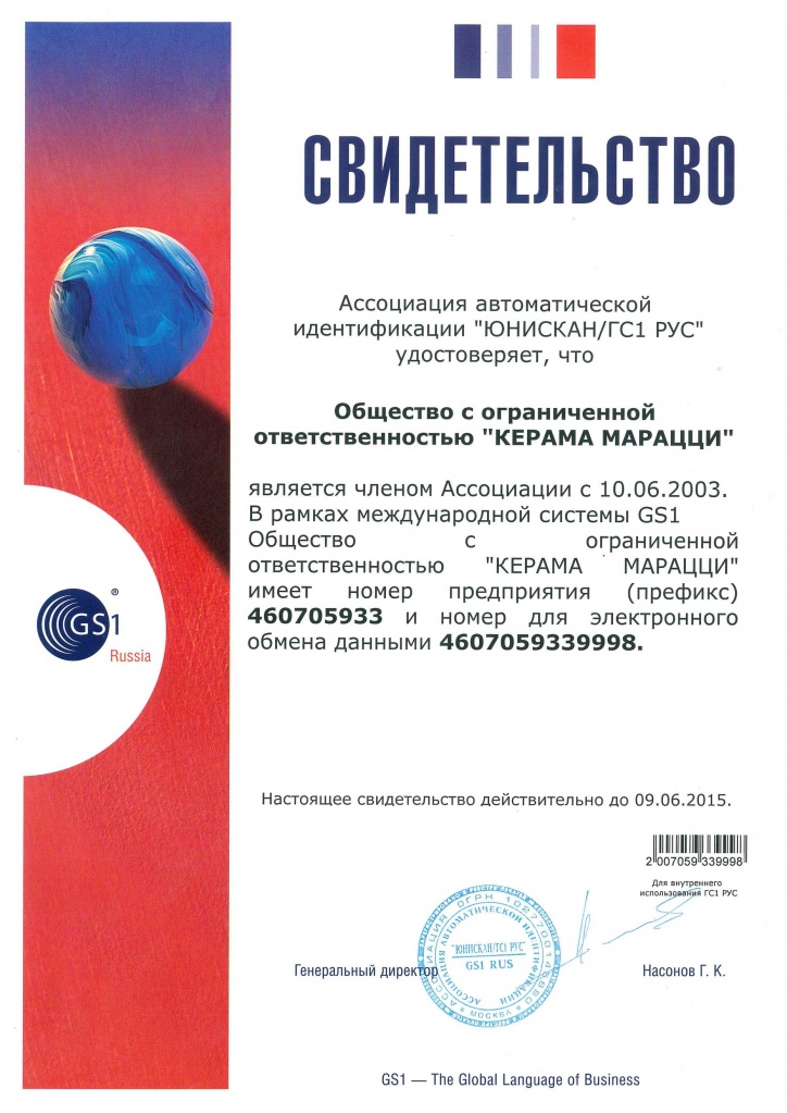 - 1. Свидетельство от Ассоциации автоматической идентификации "ЮНИСКАН/ГС1 РУС" (Малино)